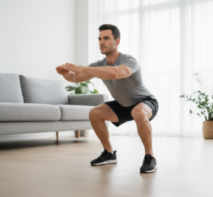 Las sentadillas sin equipo son un ejercicio en casa esencial, ideal para quienes buscan mantenerse en forma sin necesidad de máquinas ni mancuernas. Son la base de muchas rutinas de gym para hombres y rutinas de gym para mujeres, ya que fortalecen, tonifican y mejoran la resistencia física.